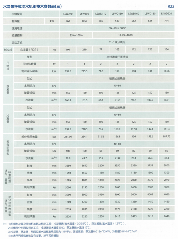 螺桿式冷水機組即風冷螺桿式冷(熱)水機組廣泛應用于賓館、商場、辦公樓、展覽館、機場、體育館等公共設施的舒適性中央空調系統,并能滿足電子、制藥、生物、輕紡、化工、冶金、制藥、電力、機械等行業的工藝性空調系統的不同使用要求。 產品種類及規格: ① 風冷螺桿冷(熱)水機組標準型系列產品冷媒可采用R22、R407C、R134A,共計80多個不同的品種規格。 ② 單機制冷量范圍為96-814kW。 ③ 機組制冷運行時能提供溫度為5-15℃的冷凍水,標準工況:出水溫度7度,回水溫度12度。 ④ 任選件:可根據用戶的特殊要求,提供輔助的功能性器件 產品的質量水平: 1、 本公司生產的風冷螺桿冷(熱)水機組的設計、生產、銷售嚴格按照ISO9001質量保證體系運行,確保產品質量。 2、 具有國際先進水平的<<風冷熱泵空調試驗室>>,用于風冷冷水機組、屋頂式空調機、除濕機、低溫空調機、高溫空調機等機組的設計、開發與試驗研究及產品的出廠測試。嚴把出廠產品質量關,讓用戶買得放心,用得稱心。 3、 風冷螺桿冷(熱)水機組系列產品經國家空調質量檢測中心測定,各項技術性能指標均高于國家標準,產品質量穩定,運行可靠,得到了國內外廣大用戶的好評,市場占有率連年增長,一直處于國內領先地位。 四、主要技術特點: 1、精選名牌配件,機組高效、節能、耐用: ① 機組的壓縮機、冷凝風機、熱力膨脹閥、熱氣旁通閥、換熱管、控制電腦等關鍵元器件均選用知名品牌廠家的產品,確保機組高效、節能、耐用。 ② 機組保溫材料為阻燃材料,避免人為因素而造成的火災事故,確保機組安全運行。 2、完備的機組控制功能,多重安全保護措施、確保機組安全運行: ①機組具備的控制功能: ? 機組啟停控制 ? 遠程、近程控制選擇 ? 機組程序設定 ? 回水溫度控制設定 ? 能量調節自動控制 ? 高水溫低水溫限定報警 ? 防冰凍保護設定 ? 壓縮機啟停程序管理 ? 壓縮機手動管理 ? 機組定時管理 ? 水泵管理 ? 可編程溫度管理 ? 全功能運行參數顯示 ? 故障報警及診斷功能 ②機組具備的安全保護功能: ? 壓縮機相序保護 ? 壓縮機過載、過熱保護 ? 冷凝風機、電機設置過熱保護 ? 系統設有高、低壓力保護裝置 ? 系統設有必備的安全閥、放氣閥、排污閥 ? 熱泵機組配備了能量調節閥,確保機組低溫運行安全、可靠 ? 電器元件具有防觸電保護 ? 防凍保護 ? 系統設有斷水保護 3、機組控制系統智能化,可提供集中監控和遠程監控接口: ①機組采用微電腦控制觸摸控制屏,中文顯示,界面友好。 ②自動化程度高,功能齊全,能實現機組啟停程序管理、定時控制、水泵管理、全功能故障報警及故障自我診斷功能等。同時可選配RS485/RS232通訊接口,方便用戶實現的機組的集中監控和遠程監控。 ③采用三級密碼保護,防止程序和設定參數被隨意更改。 ① 當機組發生故障時,立即自動停止運行,報警輸出故障信號并顯示故障原因及故障所處的地方,以便于故障排除和機組的及時維護。 ② 電機的啟停由電腦控制,并與壓縮機、冷凝風機進行聯鎖控制;壓縮機受電腦控制,供液閥和壓縮機同步動作。 4、制冷系統多回路設計,提高機組的可靠性和抗干擾能力 該系列機組如采用二臺或二臺以上的壓縮機時,均按每一臺壓縮機為一個制冷回路進行設計。每臺壓縮機之間互為備份,從而提高了機組的可靠性和抗干擾能力。 5、依托先進的性能測試裝備,確保機組性能穩定,運行安全、可靠: 擁有先進的試驗室,每一臺空調機均在廠內進行嚴格運轉試驗,確保機組在惡劣的工況下安全、可靠地運行,出廠的產品都是合格品。 螺桿式冷水機組結構特點: 1、匹配名牌優質、高效壓縮機,確保機組高能效比: ? 機組采用半封閉雙螺桿螺桿式壓縮機,與活塞式壓縮機比較,半封閉螺桿壓縮機具有如下優勢: ① 運轉部件少(約為活塞式壓縮機的1/3),結構簡單、易損件少、可靠性高,壽命長; ② 壓縮機吸排氣均勻連續,振動小,對濕壓縮不敏感,抗液擊能力強; ③ 能量調節方面,螺桿壓縮機更具優勢,通過滑閥按需可在25~100%之間自動進行能量調節;有段調節,無級調節均可實現。 2、 匹配高效能翅片式風冷冷凝器: ① 為了適合空氣含塵量大、粉塵偏多的中國國情,風冷冷凝器采用獨特的翅片形狀及結構,強化平片式鋁翅片由進口專用加工設備整體沖壓制作而成,在使傳熱效果顯著提高的同時,表面不易積灰,也便于清洗,防止病菌在翅片上滋生,確保換熱器良好的換熱能力。 ② 換熱器鋁翅片表面經過特殊處理,提高了翅片的耐腐蝕性能,使換熱器的耐用度大大提高。 ③ 風冷式冷凝器采用銅管套鋁翅片結構,其鋁翅片、換熱管均采用進口材料,抗污垢、耐腐蝕。紫銅管、波紋型鋁翅片經機械脹管而成,使其結合緊密,換熱效率高,傳熱系數大;換熱器管板支承板均采用優質不銹鋼板.抗腐蝕能力強、耐用度高。 ④ 冷凝器加工過程中采用先進的清洗技術,提高了熱換器的表面清潔度,從而確保了換熱器的高效換熱能力。 ⑤ 采用獨特的換熱器制冷流程,合理的匹配風量與迎面風速,確保制冷流程與風側冷量的平衡關系,充分發揮了壓縮機的制冷能力和換熱器的換熱能力,使機組高效節能。 ⑥ 冷凝器采用獨特“倒M”型布置,結構緊湊,占地面積小、過風均勻,克服冷凝器氣流短路現象,充分發揮冷凝器換熱能力。 3、 匹配高效能換熱管的干式殼管蒸發器: ① 