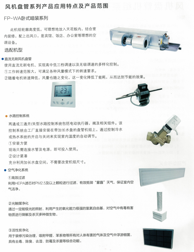 風機盤管機組主要由離心風機、盤管換熱器等構成,是中央空調系統的末端裝置,它廣泛應用于賓館、飯店、工廠、醫院、展覽館、商場以及辦公大樓等多房間或大空間工業和民用建筑的空調場合,以滿足降溫去濕、采暖等要求,為人們創造一個清新、寧靜、四季如春的工作和生活環境。