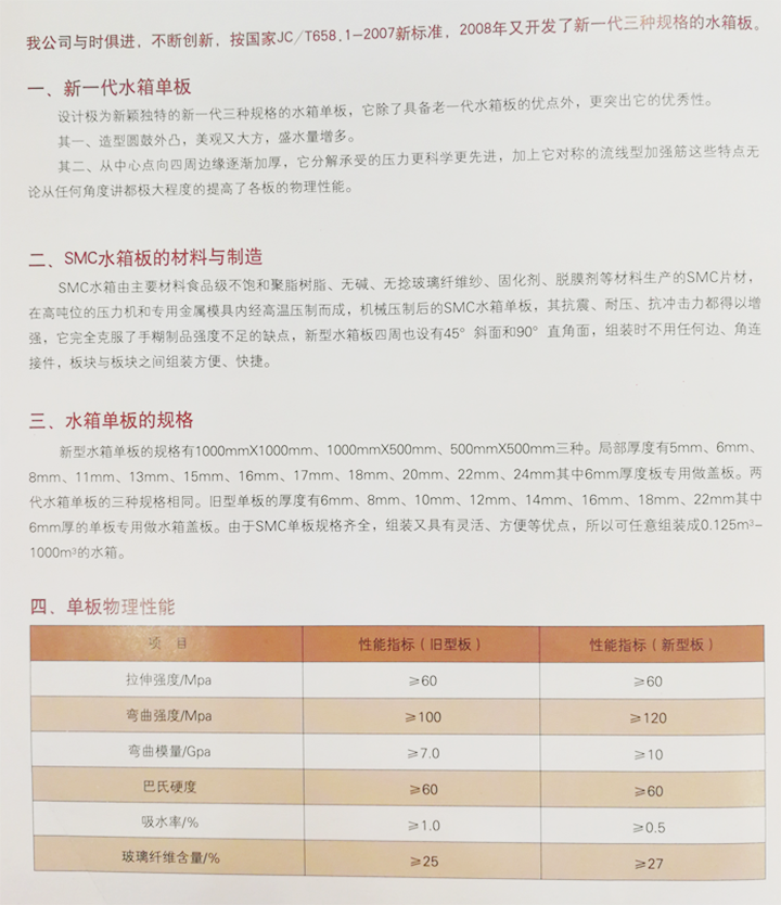 SMC組合式玻璃鋼水箱是目前國際上采用的新型水箱。其特點是采用食品級樹脂,因此水質好,清潔無污染;具有強度高,重量輕,耐腐蝕,外型美觀,使用壽命長,保養管理方便等特點。