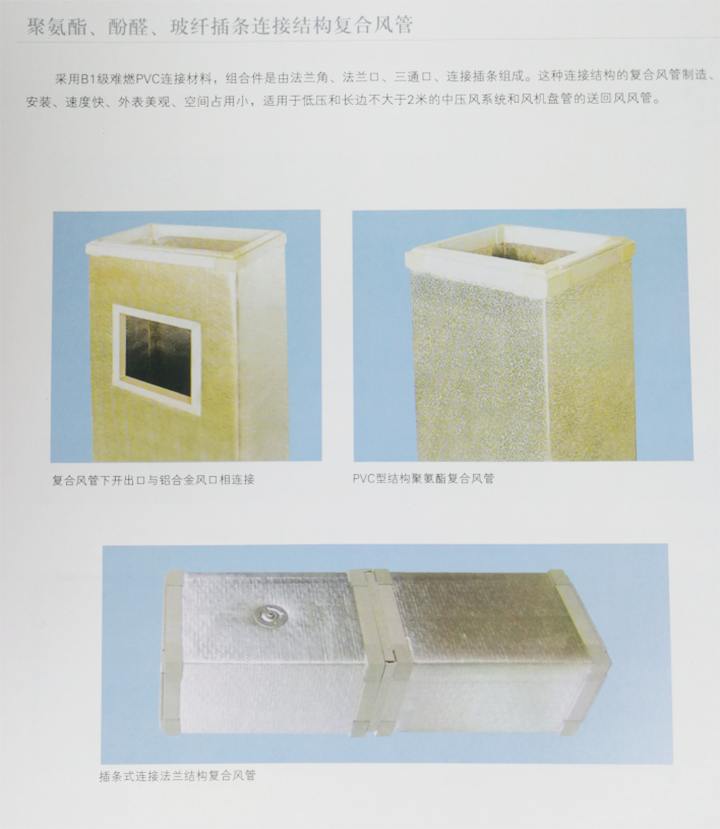 酚醛復(fù)合風(fēng)管中間層為酚醛泡沫,內(nèi)外層為壓花鋁箔復(fù)合而成。酚醛泡沫板與鋁箔復(fù)合制成夾芯板,然后加上專(zhuān)用法蘭配件,制成的酚醛復(fù)合風(fēng)管用于中央空調(diào)通風(fēng)。