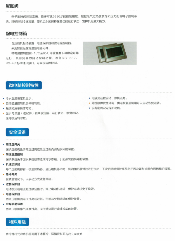 螺桿式冷水機組即風冷螺桿式冷(熱)水機組廣泛應用于賓館、商場、辦公樓、展覽館、機場、體育館等公共設施的舒適性中央空調系統,并能滿足電子、制藥、生物、輕紡、化工、冶金、制藥、電力、機械等行業的工藝性空調系統的不同使用要求。