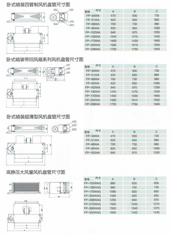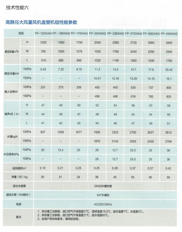 風機盤管機組主要由離心風機、盤管換熱器等構成,是中央空調系統的末端裝置,它廣泛應用于賓館、飯店、工廠、醫院、展覽館、商場以及辦公大樓等多房間或大空間工業和民用建筑的空調場合,以滿足降溫去濕、采暖等要求,為人們創造一個清新、寧靜、四季如春的工作和生活環境。 本公司風機盤管機組經過設計優化,盤管性能大幅提高,盤管機組分為高效型和標準型兩種;其中標準型風機盤管能滿足國標要求的各項參數,高效型風機盤管的性能參數優于國標要求20%以上。 FP-WA臥式暗裝風機盤管,此機組輪廓高度低,可理想的放入天花板內,結合室內裝修,配上出風口,是賓館、飯店、辦公室等理想的空調設備。 直流無刷風機盤管 使用直流無刷電機,實現高中低三檔調速以及無級調速的多樣化控制。 1、工作轉速范圍大,可滿足各種風量模式下的轉速要求。 2、隨著電機轉速降低,風量也隨之變化,這一變化降低了能耗,從而達到節能的效果。 水路控制系統 兩通或三通開/關型水路控制系統包括電動執行器,閥及其相關組件。該控制系統由工廠直接安裝在帶加長水盤的盤管機組上,通過控制冷水或熱水系統的開啟與關閉來實現室內溫度的自動調節。 1、安裝方便,現場只需連接水管及電源,即可投入使用。 2、設計緊湊,充分利用加長水盤空間,不需要改變機組尺寸。 FP-WA臥式暗裝風機盤管機組特點 1、安全可靠,壽命長 每臺盤管換熱器都經過壓力檢漏;進出水接管(集水頭采用鍛黃銅結構,可靠耐用);凝水盤噴塑處理,不生銹,全部材料系仿活型;電動機采用超低噪聲滾動軸承,無需用戶加油維修,使用壽命可達35000小時;電動機細長軸徑特殊處理無銹蝕。 2、效率高,能量組 風機盤管采用無縫紫銅管串套搞笑的雙翻邊鋁肋片并肋緊成一體,傳熱效率高,冷(熱)量富足,標準型盤管能滿足國標要求性能,高效型盤管性能達到了國際領先水平。 3、風量大,噪音低 風機盤管采用超廣角蝸殼,鋼板制多葉離心風輪,風輪與電動機可有多種優先匹配,以滿足風機盤管機組各個規格的需要。 4、選用靈活 考慮安裝工地各有其特殊性及場地限制等原因,本公司提供不同長度水盤供客戶選擇。 1、標準水盤——使所需安裝位置縮小,特別適用于安裝空間狹小的場所。 2、加長水盤——能更好的接住閥門漏水和凝結水。 風機盤管安裝、使用說明 1、風機盤管安裝在水平面上,保持垂直,不得傾斜;臥式機組,安裝時四個吊點一定要保持機組水平,防止凝結水管一端抬高造成凝結水外溢。 2、進出水管路應裝有閥門,以便于調節和檢修,并且必須注意進出水管的清潔和保溫工作,凝結水塑料管不得壓偏,不得有死彎,以保證使用時凝結水暢通。 3、機組三檔調速開關,開啟時應從高檔啟動,然后進行其他檔次的選擇,多機共用時,必須單機控制。 4、機組用電源:單相220v±10%,50Hz交流電機殼應安裝接地線,若機組啟動有困難,務必注意檢查電源是否正常,風輪與風機蝸殼是否接觸,機組安裝時必須注意外殼,換熱器肋片和風機等不要碰壞以免影響美觀和性能。 5、機組夏季供冷水溫度不得低于7℃,冬季供熱水溫度不得高于80℃,使用冷、熱水必須考慮個地方水質情況進行軟化處理。 6、機組允許使用壓力最大1.6MPa。 7、過濾器要進行定期清洗,保持清潔,確保傳熱良好。 8、接通電源后應先開動風機觀察其旋轉方向是否正確。 9、機組如果裝在暗處,要設有檢修門,便于常年維護。 10、機組在維修時應切斷電源。 11、卡式風機盤管安裝、使用詳見隨機說明書。 12、隨著我廠技術水平的不斷提高,對產品規格本廠有權更改,若機組的性能參數更改,以隨機的技術文件為準,不另行通知。 訂貨指南 1、選用風機盤管機組,請明確產品的規格型號及其進出水的左右式。 2、臥式暗裝風機盤管機組選配回風箱時,請注明回風方式是下回風還是后回風。 3、臥式暗裝風機盤管機組分低靜壓(12Pa)和高靜壓(30Pa、50Pa)三種,請在訂貨時注明。如無特殊要求,則按低靜壓型供貨。