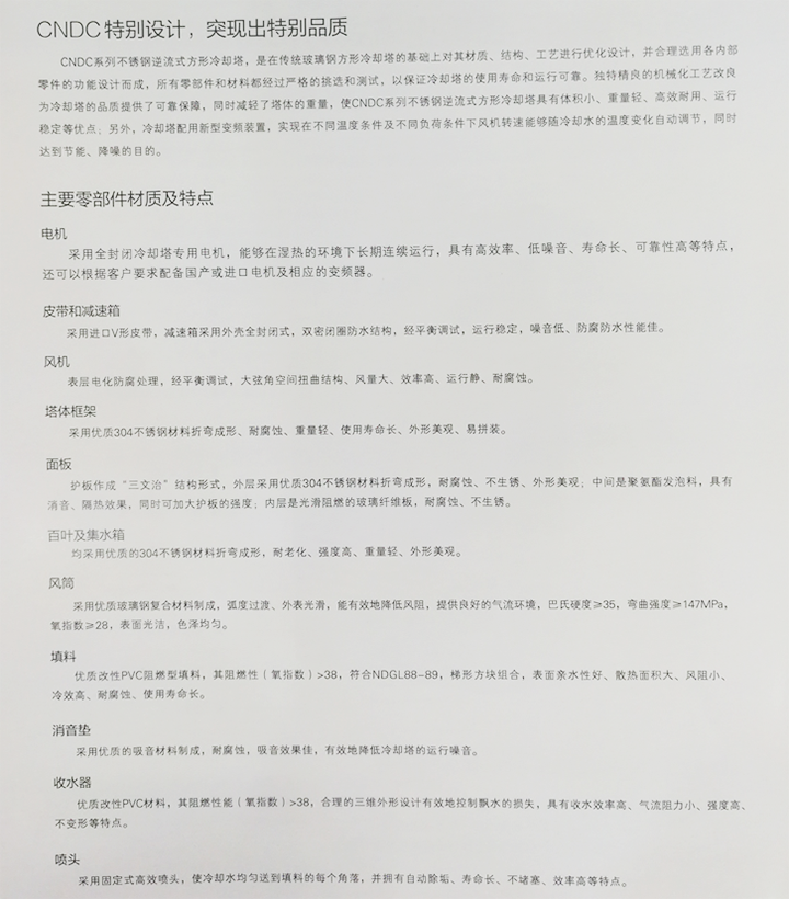 1、優(yōu)質(zhì)304不銹鋼材料折彎成型、可重復(fù)再生利用; 2、護(hù)板采用304不銹鋼復(fù)合結(jié)構(gòu),結(jié)構(gòu)輕巧,隔熱吸震效果優(yōu)良; 3、生產(chǎn)過程中不會(huì)產(chǎn)生對(duì)環(huán)境、人體的損害,是當(dāng)今冷卻塔行業(yè)的環(huán)保先鋒; 4、填料插入到水面,避免了由于水落差而產(chǎn)生的噪聲; 5、使用大風(fēng)機(jī),低轉(zhuǎn)速運(yùn)行,大風(fēng)量,低能耗; 6、采用填料自帶收水特殊結(jié)構(gòu),優(yōu)質(zhì)改性PVC專用收水裝置; 7、模塊設(shè)計(jì)、特別適合多臺(tái)塔接在一起,占地面積小、美觀大方; 8、單模塊處理水量:100~600m3/h;模塊之間自由組合; 9、廣泛應(yīng)用于中央空調(diào)系統(tǒng)工程;